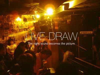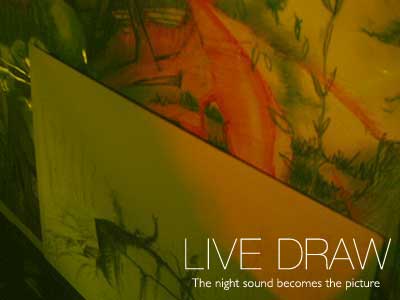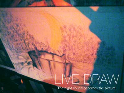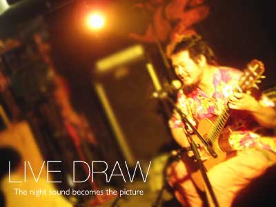 すぐトップバッターの百姓すの平さんのライブが始まります。前日のラストを飾った、バンド、というよりおもしろギターリストという感じの2人が一気に雰囲気を盛り上げます!関西のノリ、まったりした雑談が和やかなムードを作り出します。その間に、新しい紙を準備し、木炭で描き始めました。サイズは大阪花火4の4分の1です。
